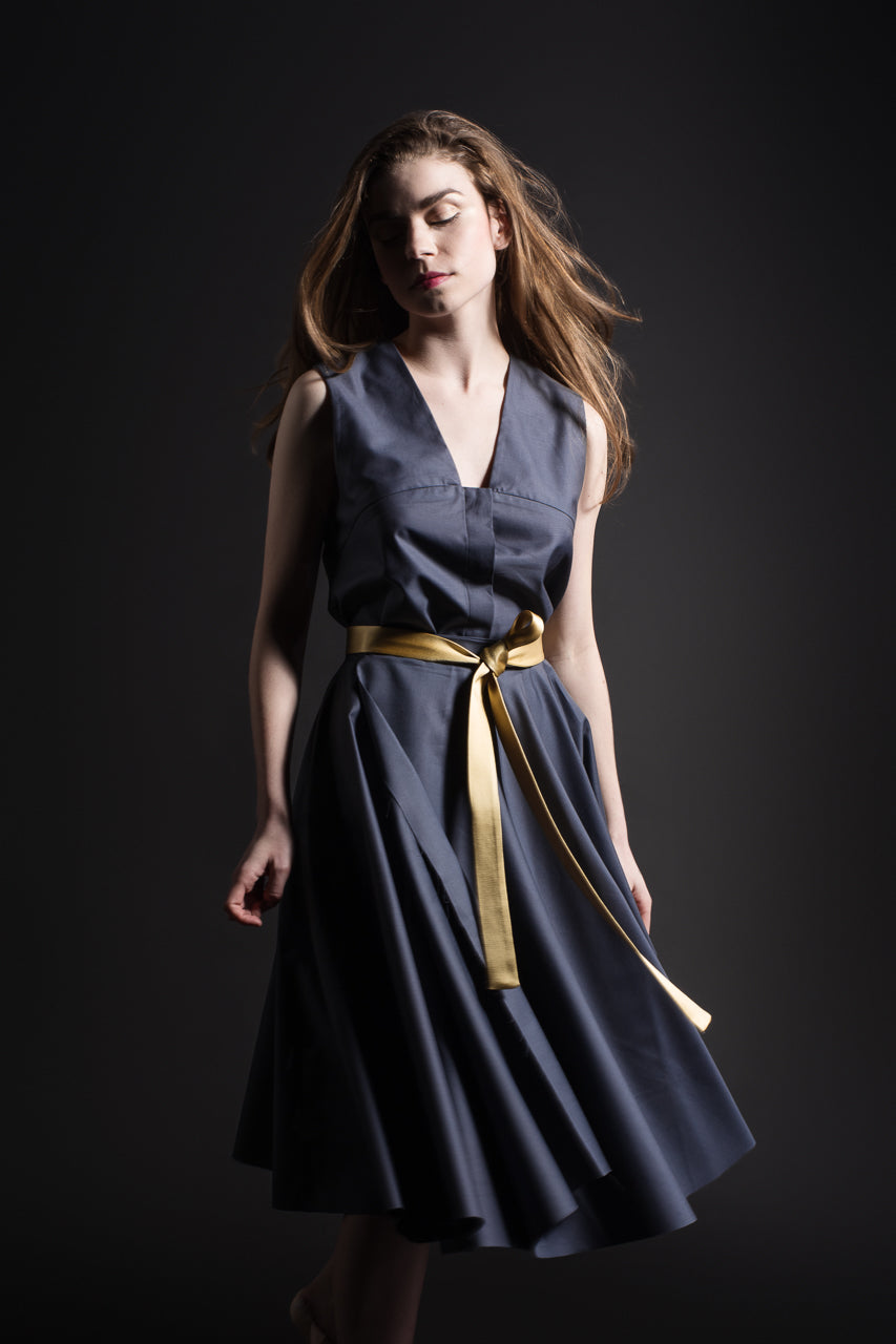 Summer button-down dress with a large skirt and a contrast belt.
