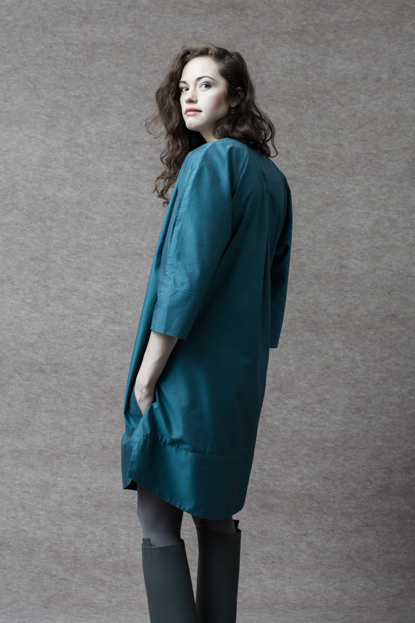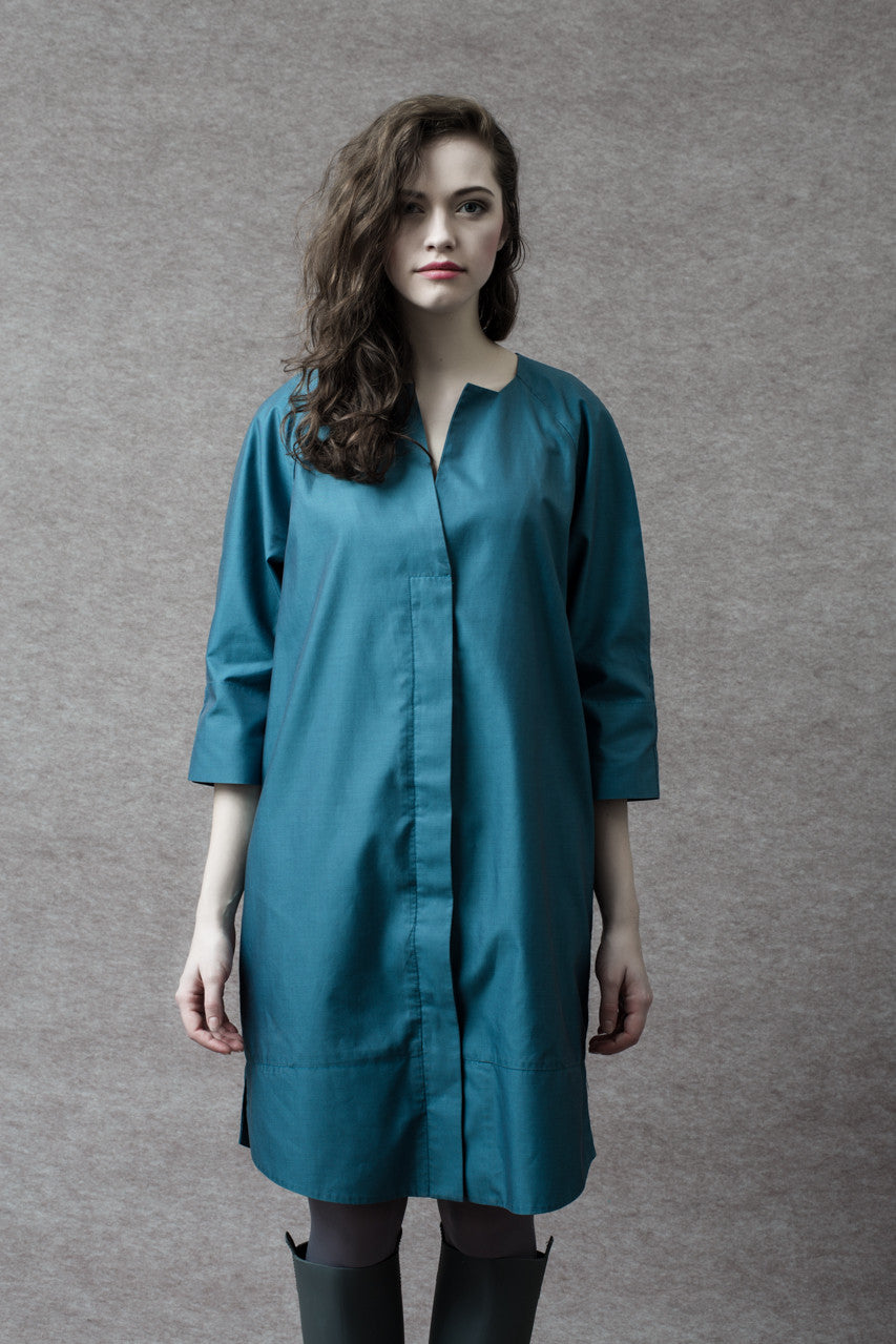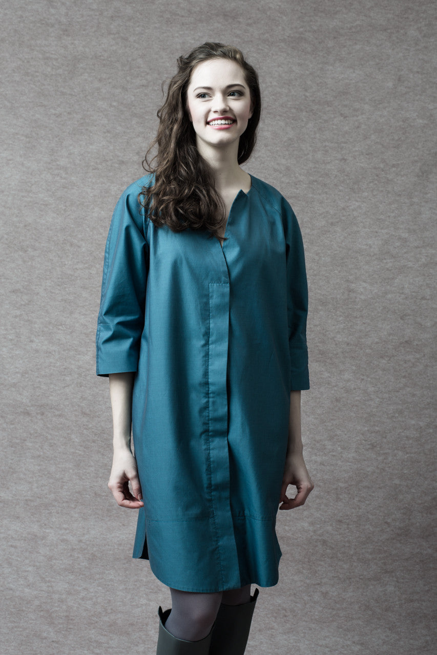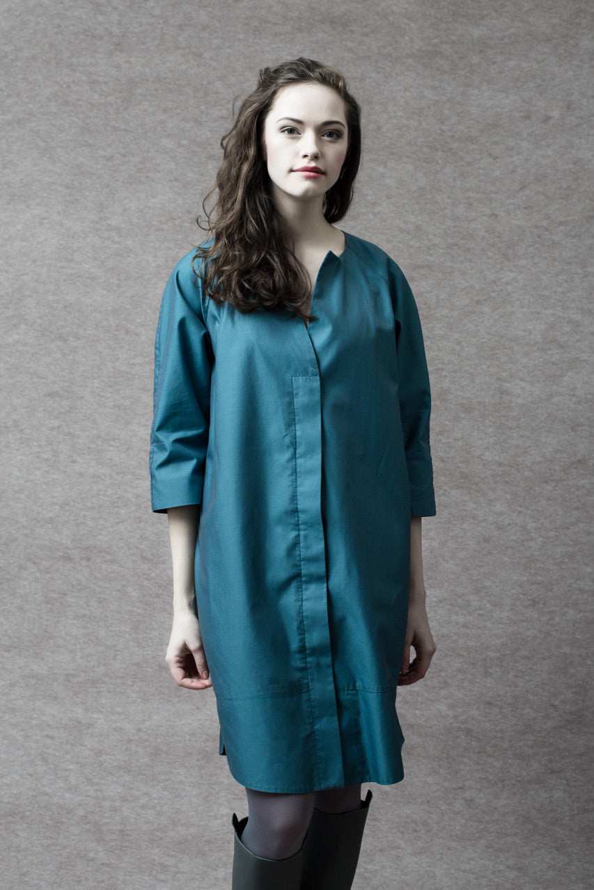 Hidden button shirt dress with 3/4 sleeves, pockets, 100% cotton