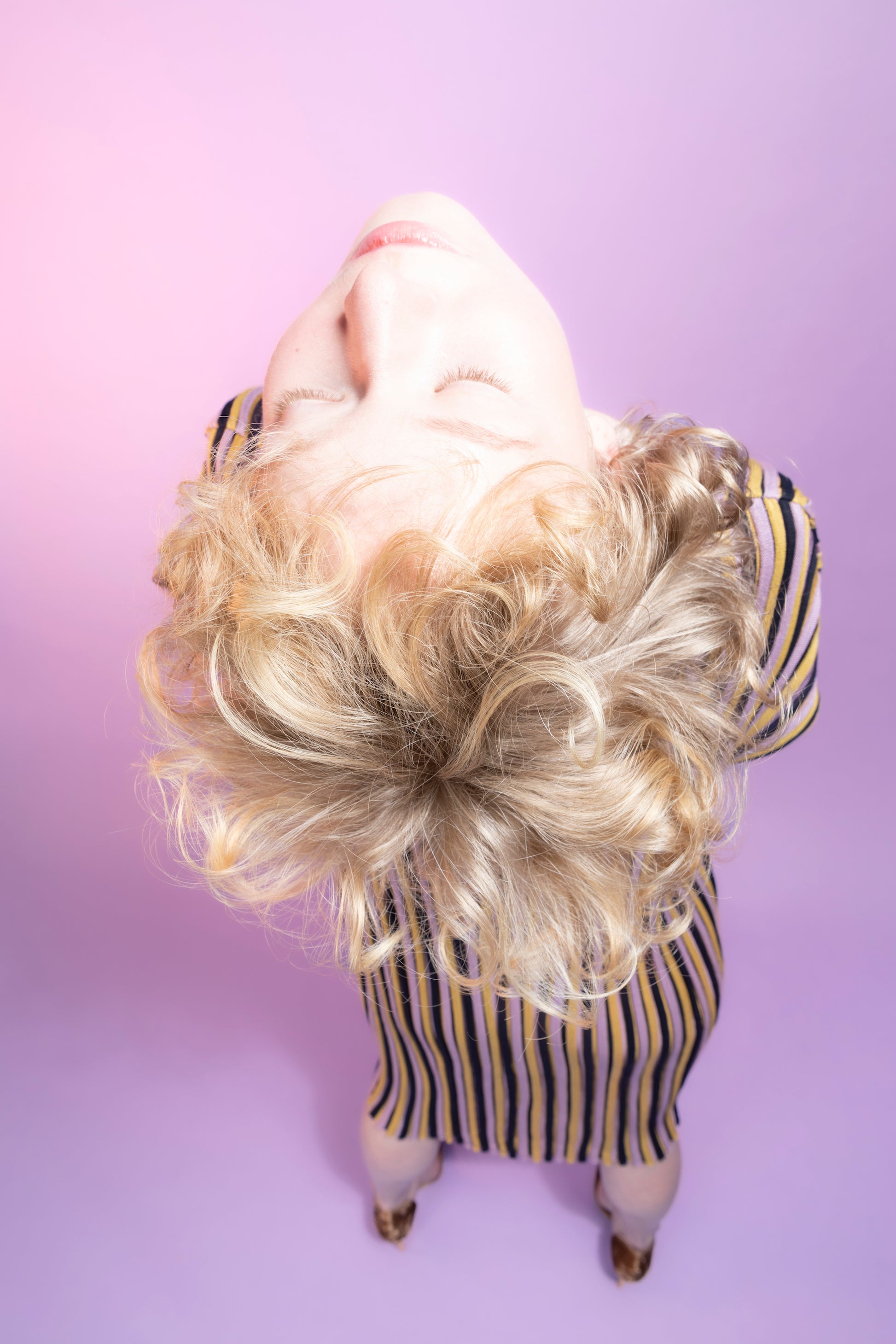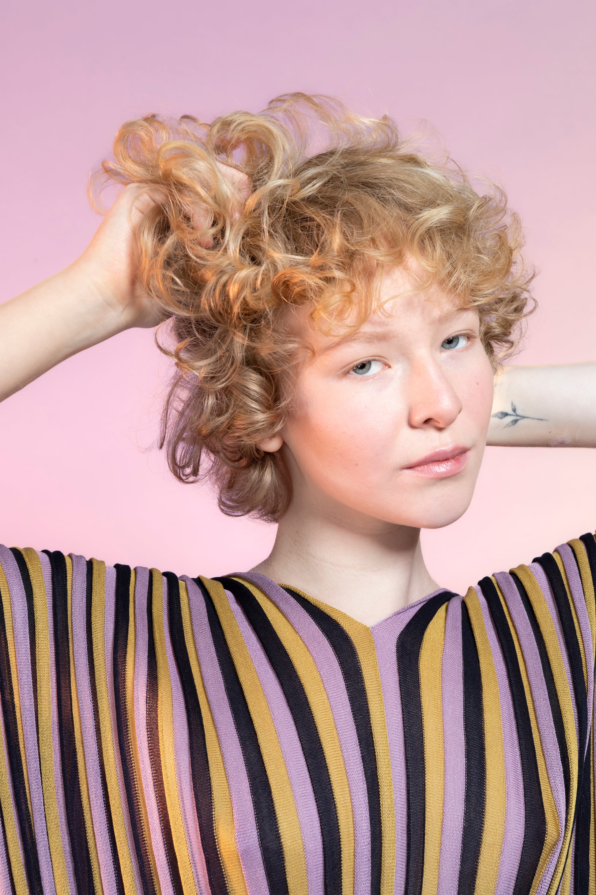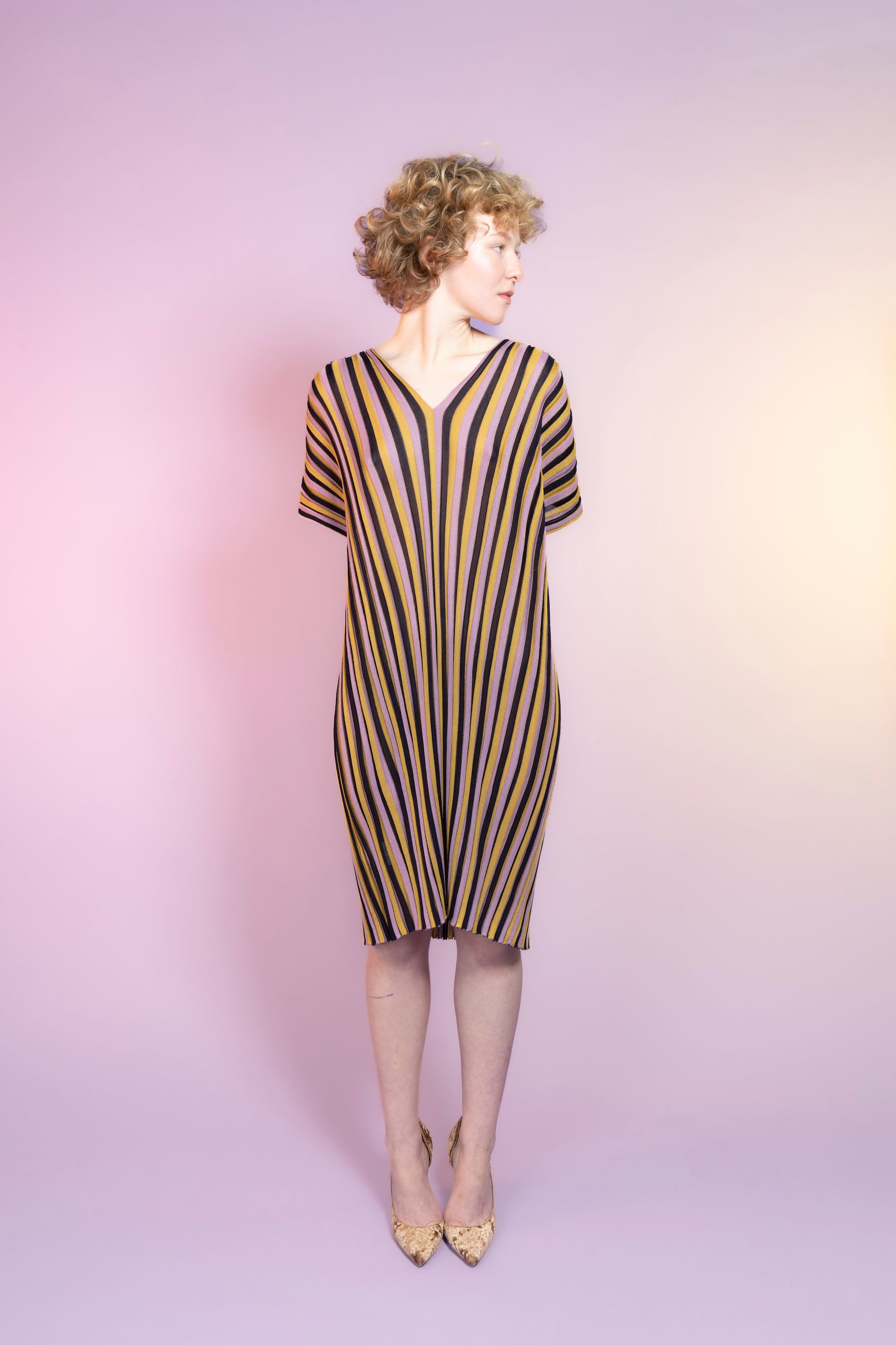 Striped ribbed summer short sleeve dress, knitted from 100% silk. Designed and manufactured in the Czech Republic. The knitwear is very flexible, it can handle more sizes. Model's height 174 cm. Dress length 93 cm. We produce in two color versions MATCHA (black, yellow, green tea) x LILA (black, yellow, lilac).