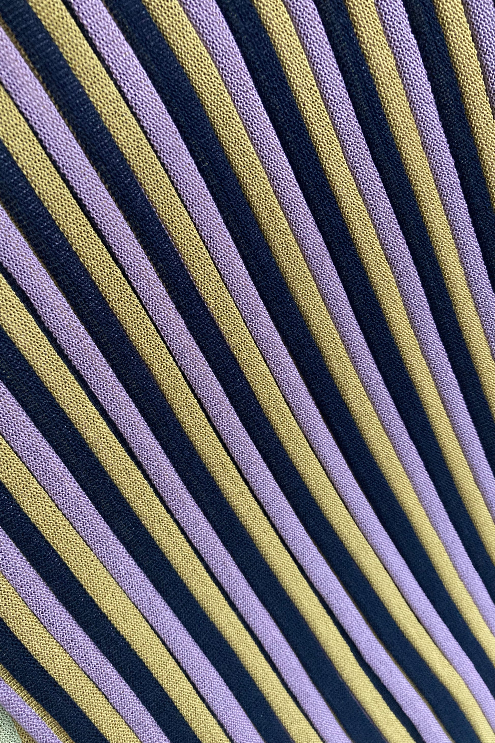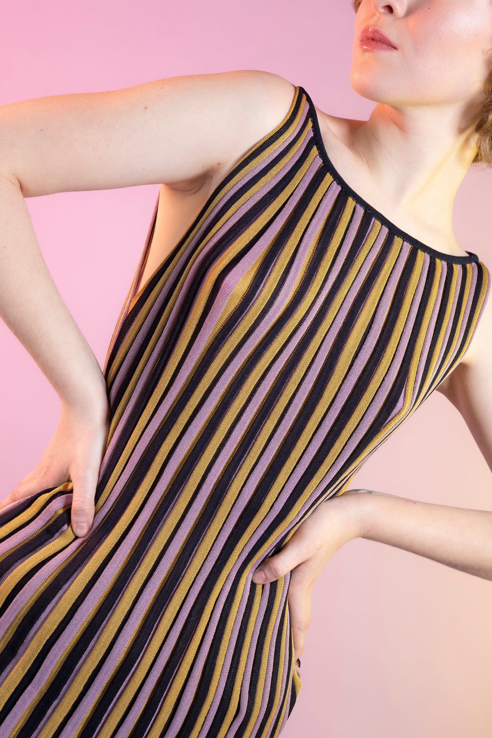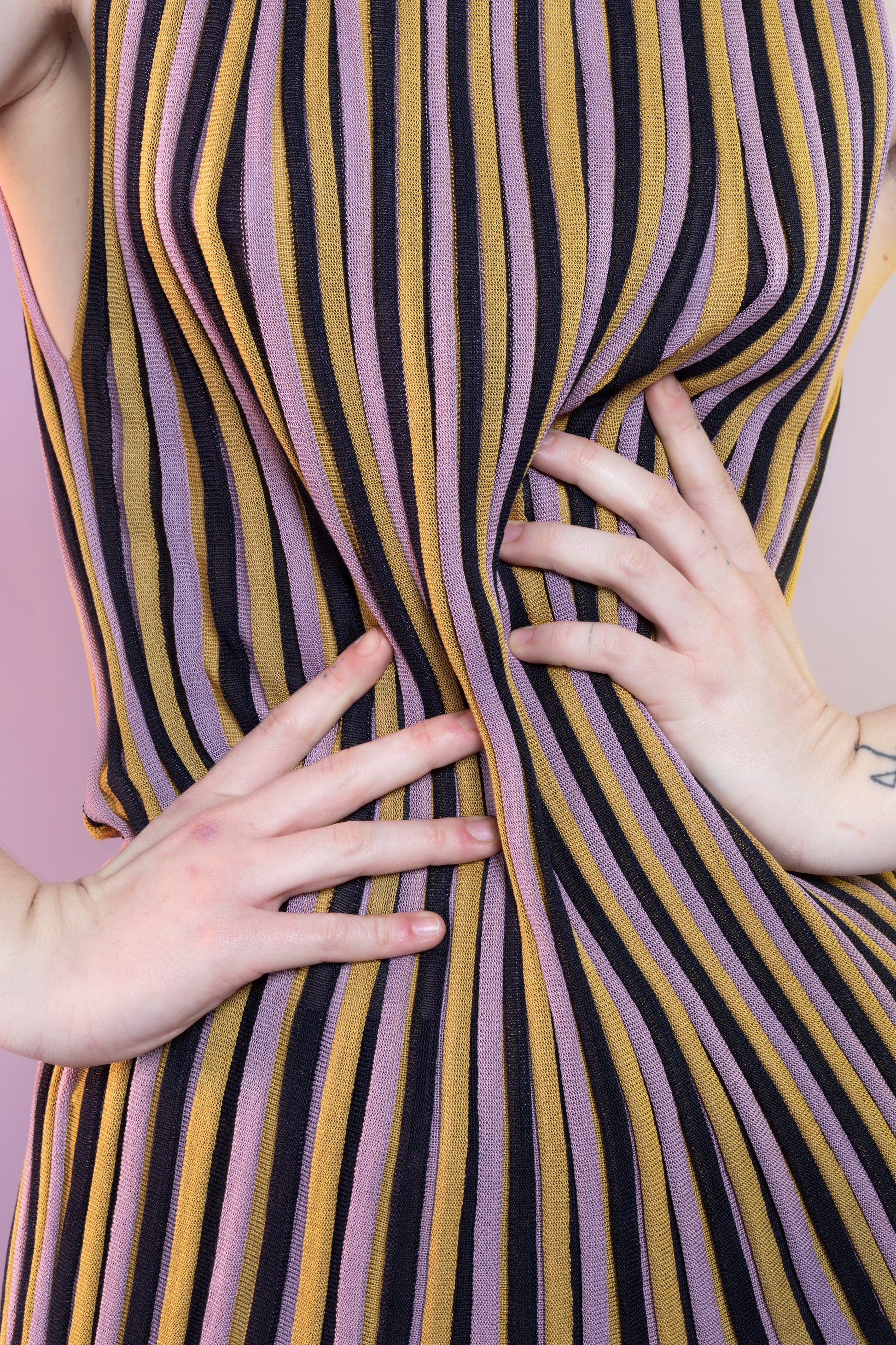 Striped ribbed summer sleeveless top knitted from 100% silk. Designed and manufactured in the Czech Republic. The knitwear is very flexible, it can handle more sizes. Model's height 174 cm. Top length 65 cm. We produce in two color versions MATCHA (black, yellow, green tea) x LILA (black, yellow, lilac).