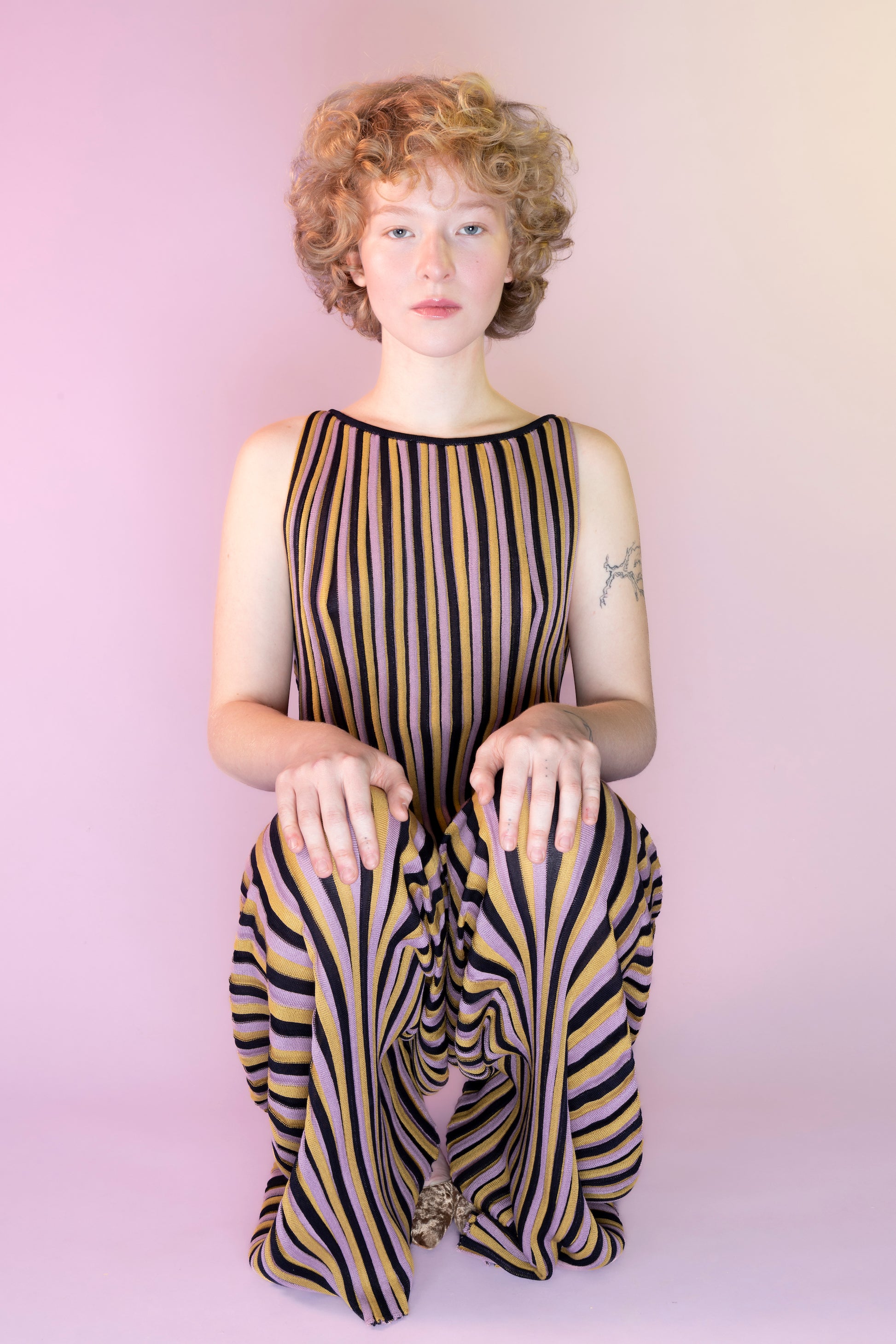 Pruhovaný žebrovaný letní top bez rukávů, pletený ze 100% hedvábí. Navrženo a vyrobeno v České republice. Úplet je velmi pružný, pojme více velikostí. Výška modelky 174 cm. Délka topu 65 cm. Vyrábíme ve dvou barevných kombinacích MATCHA (černá, žlutá, zelený čaj) x LILA (černá, žlutá, šeřík).
