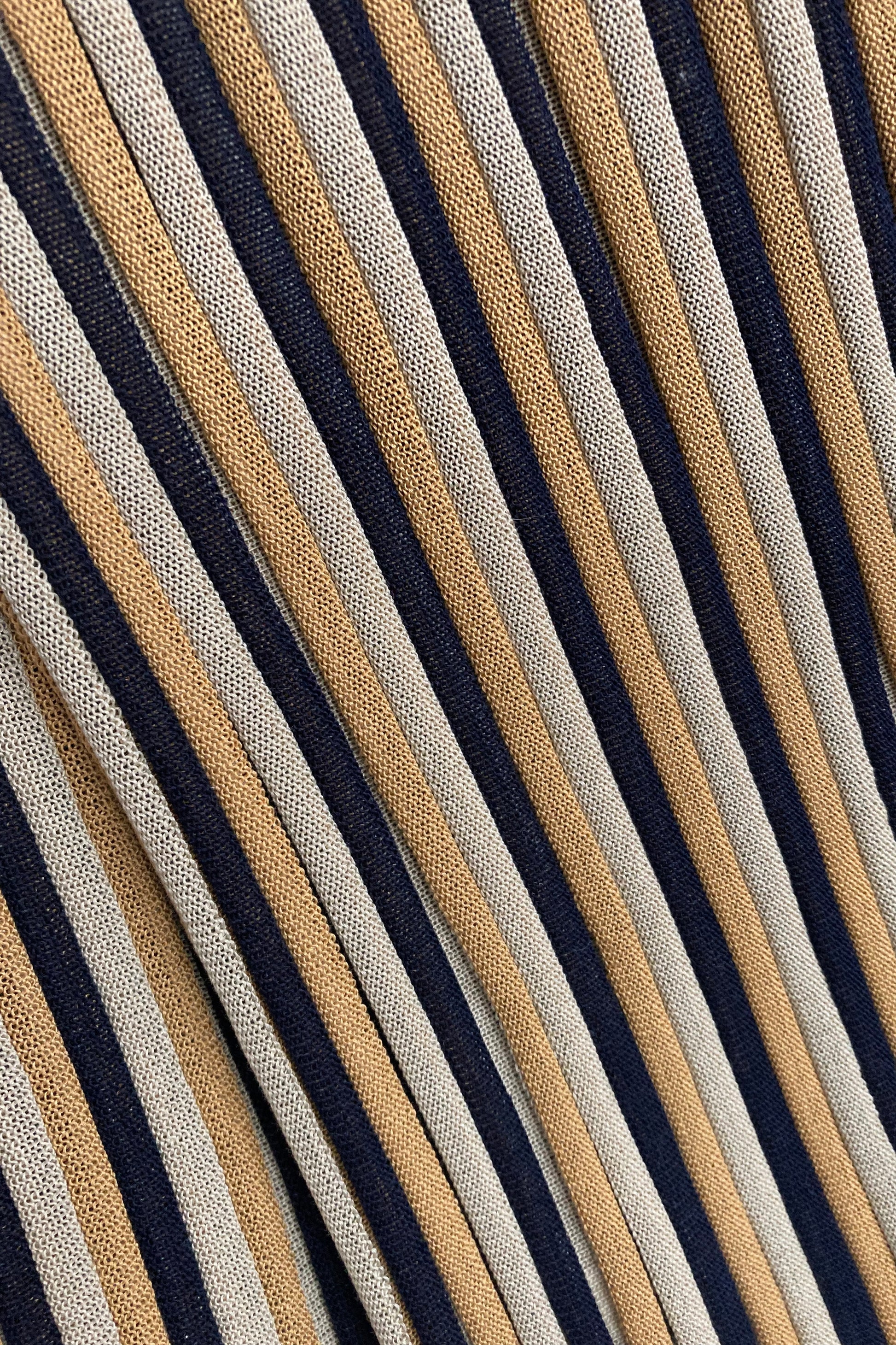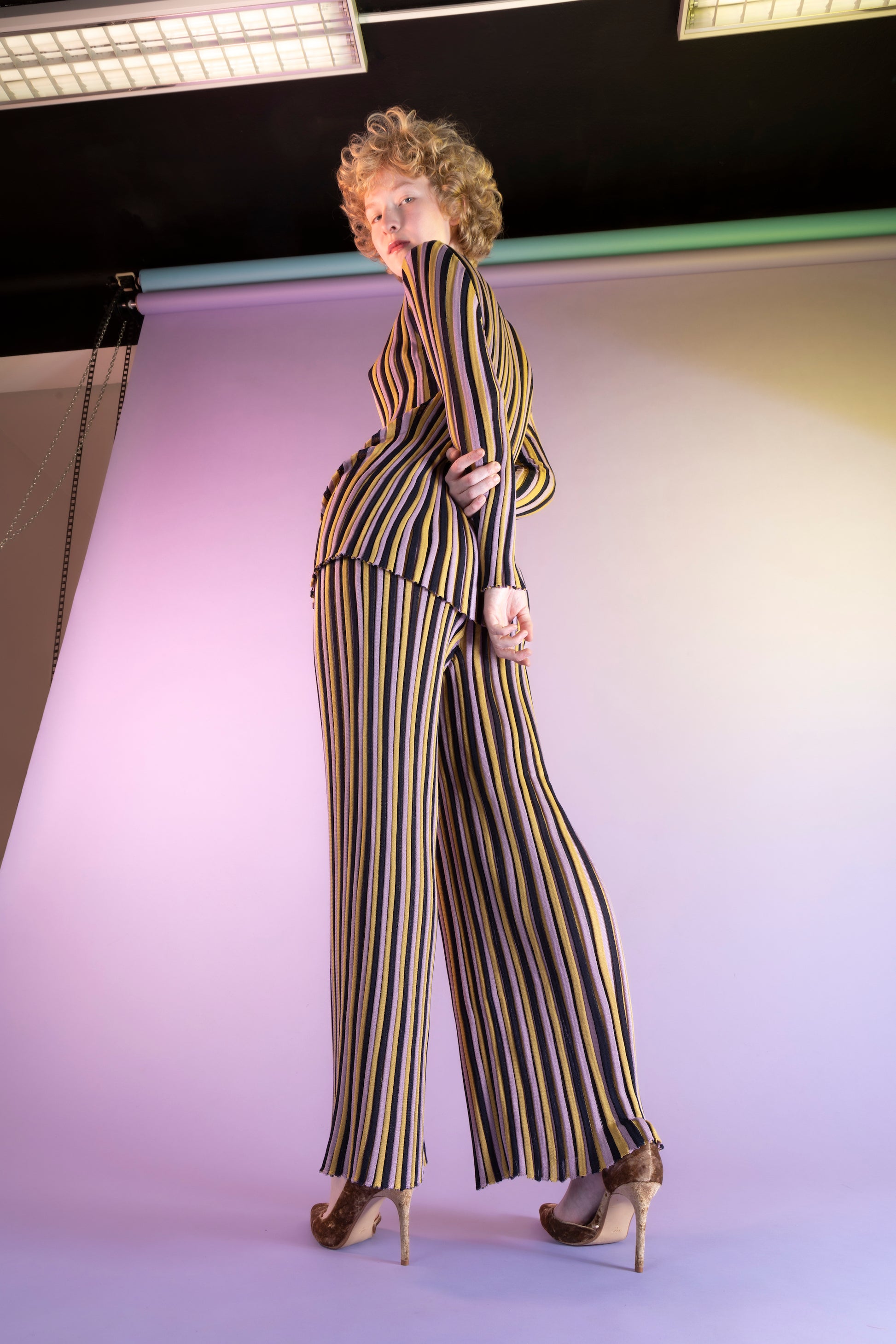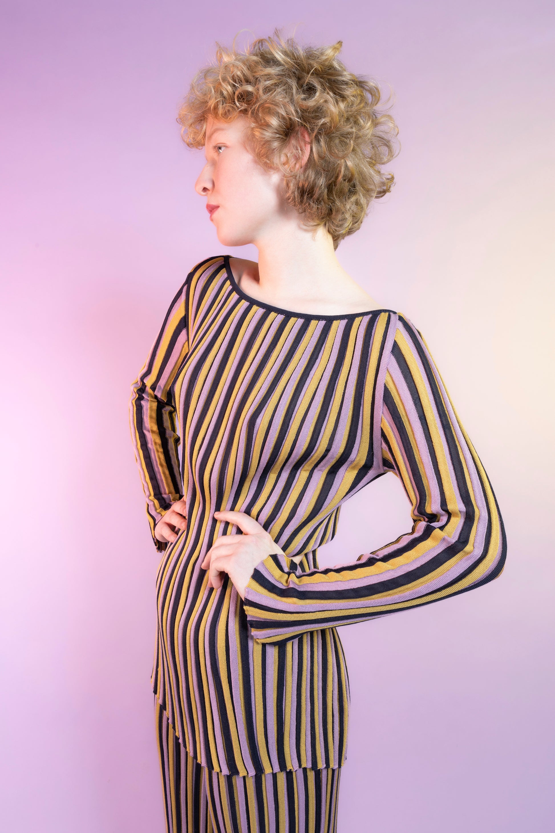 Striped ribbed summer sleeve top, knitted from 100% silk. Designed and manufactured in the Czech Republic. The knitwear is very flexible, it can handle more sizes. Model's height 174 cm. Top length 68 cm. We produce in two color versions MATCHA (black, yellow, green tea) x LILA (black, yellow, lilac).