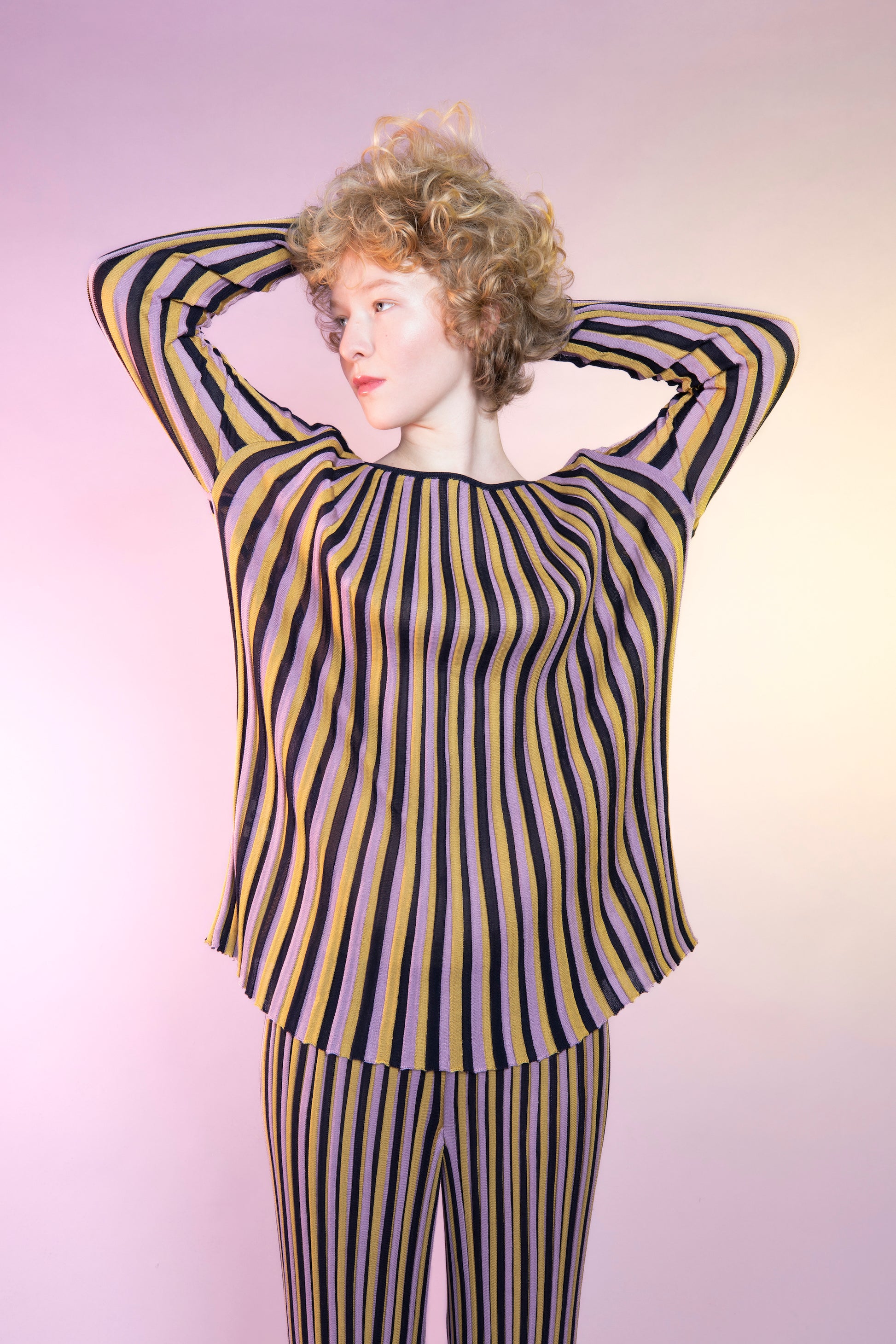 Pruhovaný žebrovaný letní top s rukávy, pletený ze 100% hedvábí. Navrženo a vyrobeno v České republice. Úplet je velmi pružný, pojme více velikostí. Výška modelky 174 cm. Délka topu 68 cm. Vyrábíme ve dvou barevných kombinacích MATCHA (černá, žlutá, zelený čaj) x LILA (černá, žlutá, šeřík).