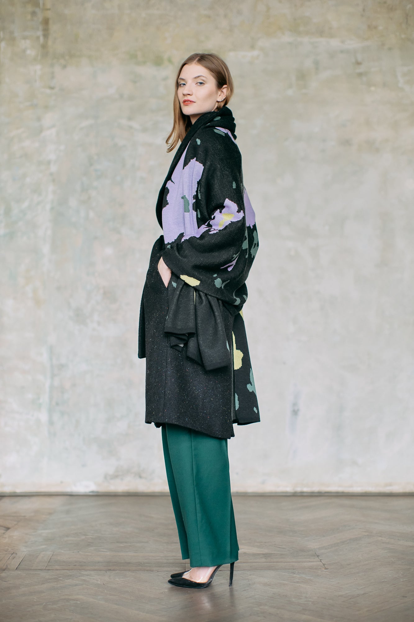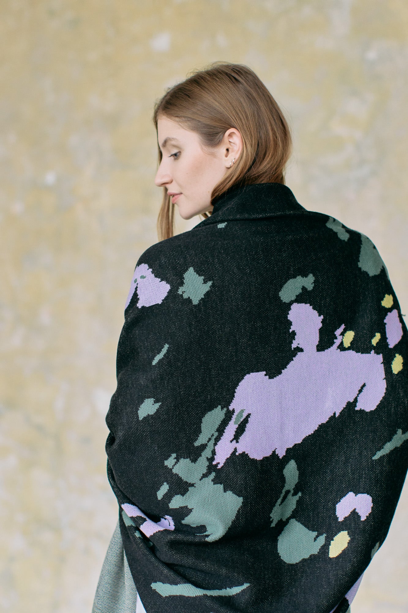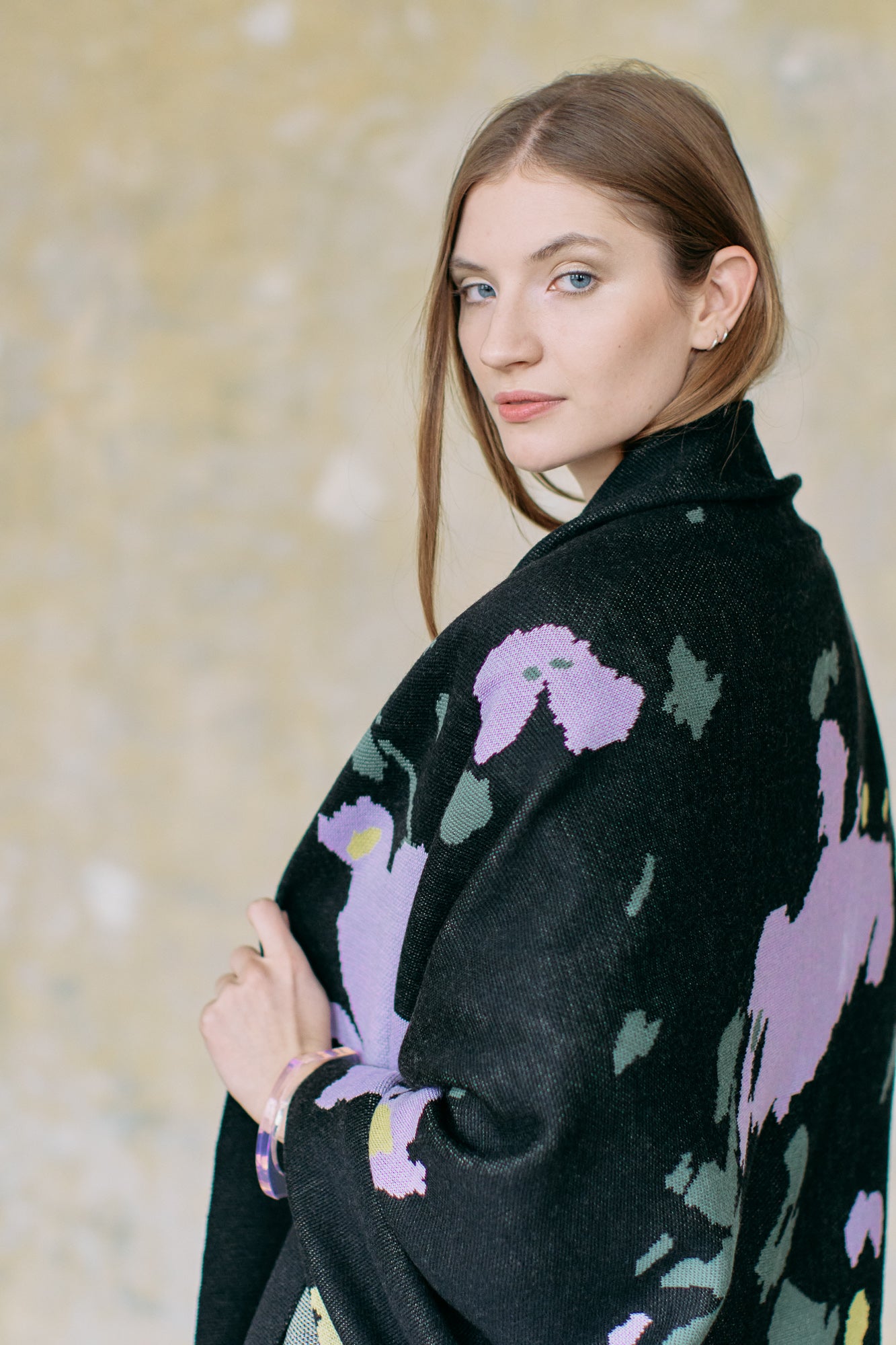 Woolen plaid knitted with a jacquard pattern, 100% Wool®Cashwool. A delicately stylized meadow pattern on the BLACK background. Complementary decor colors - LILAC, YELLOW, GREEN.