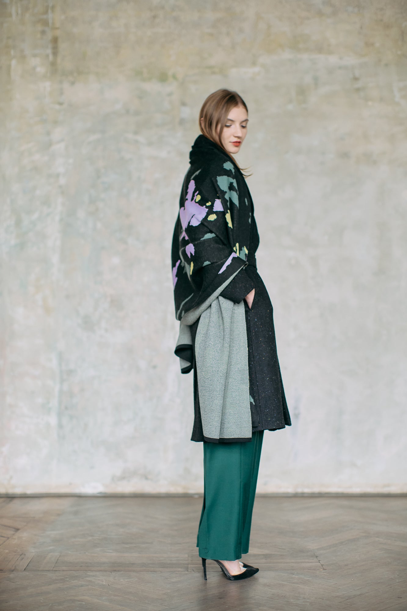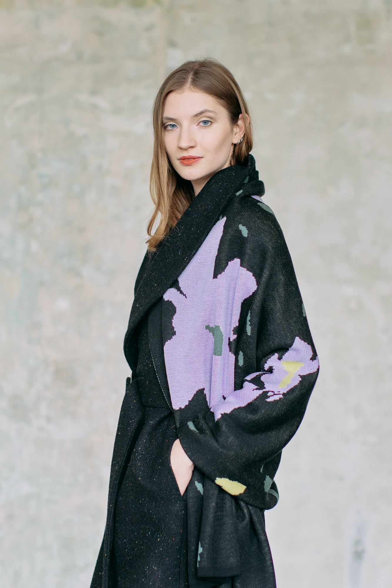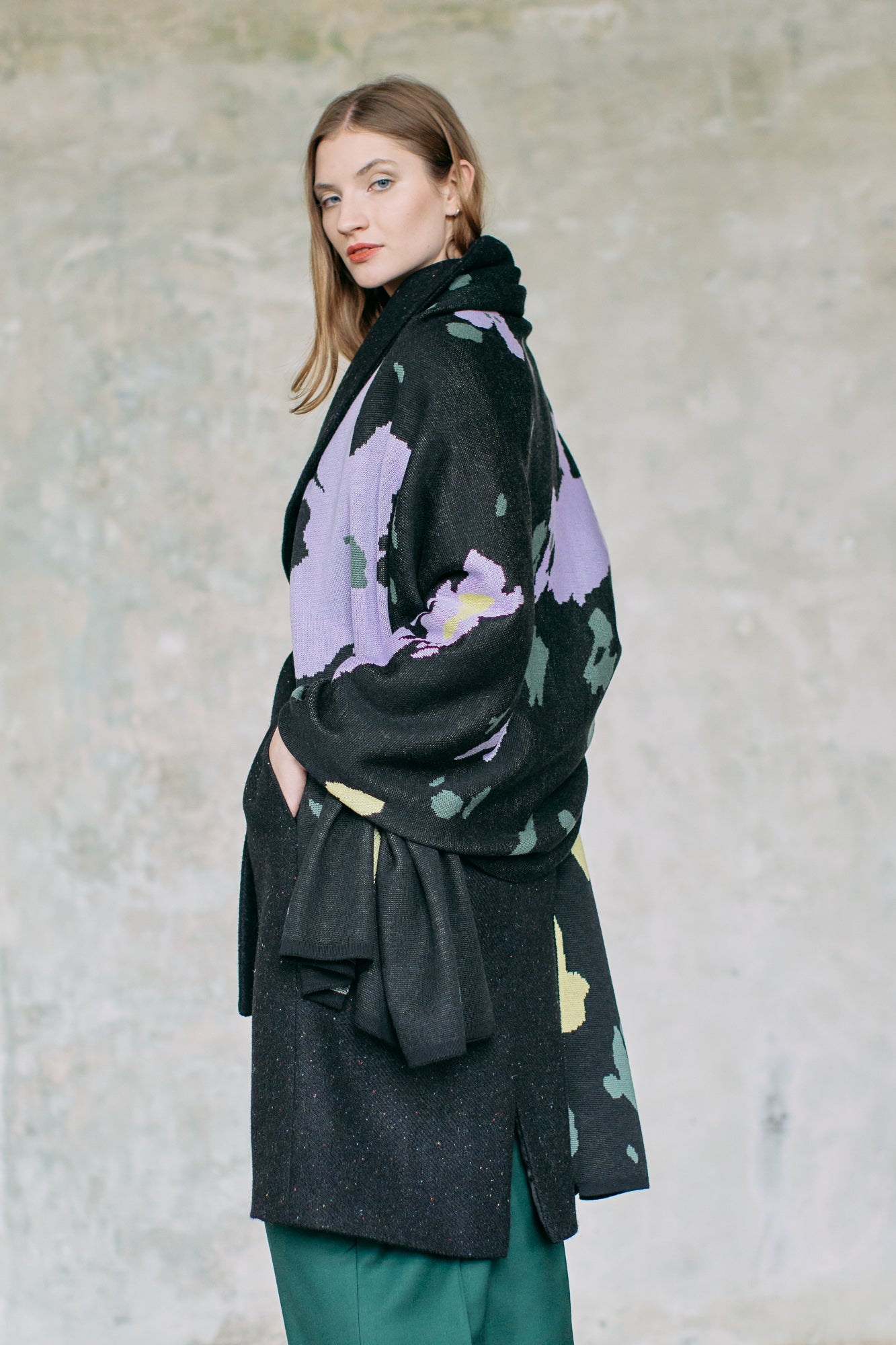 Woolen plaid knitted with a jacquard pattern, 100% Wool®Cashwool. A delicately stylized meadow pattern on the BLACK background. Complementary decor colors - LILAC, YELLOW, GREEN.