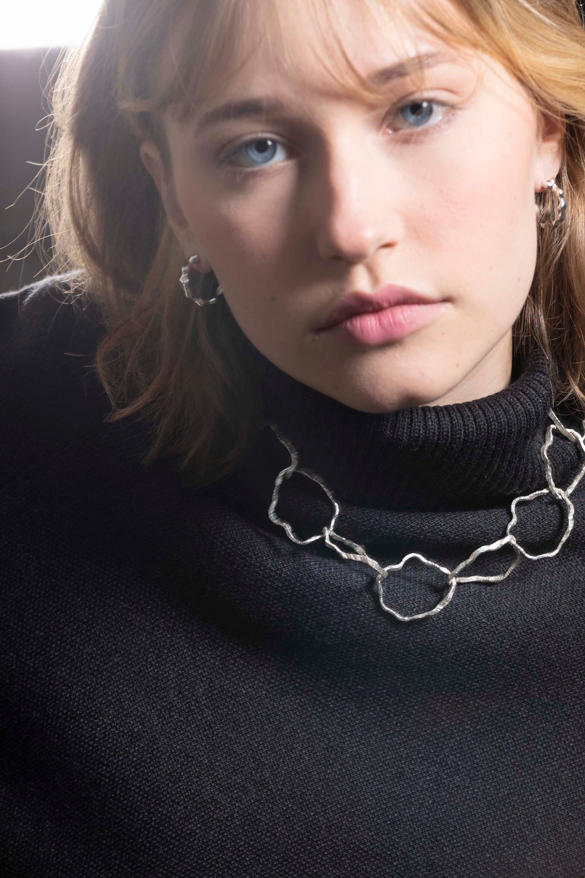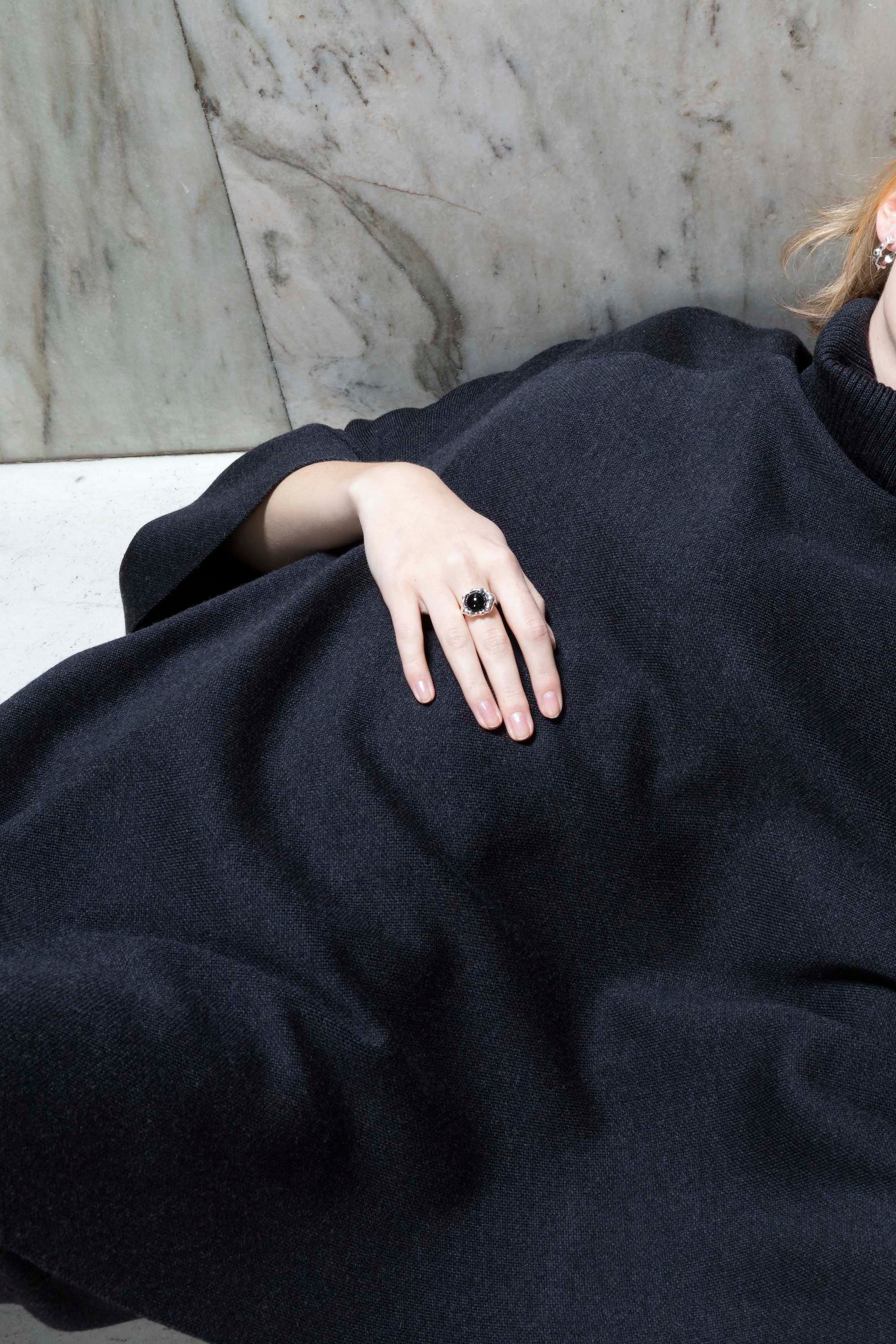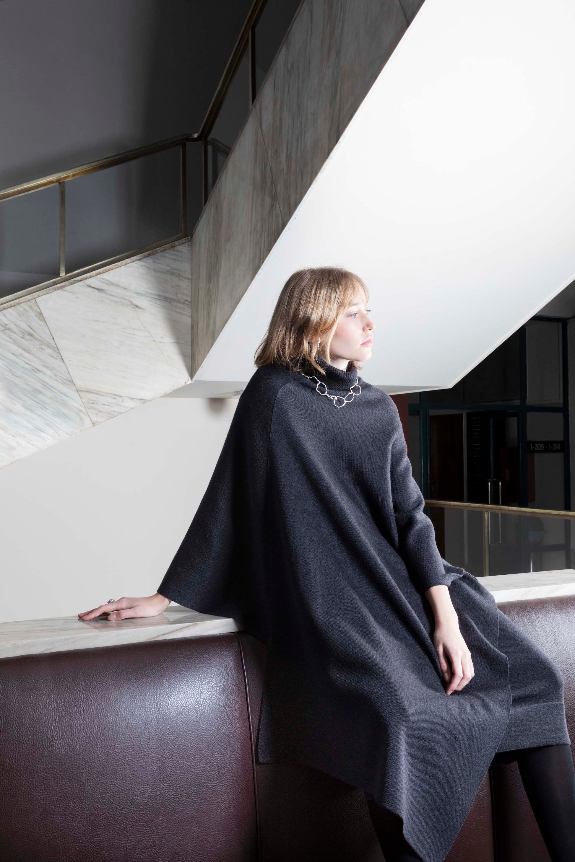 Asymetrické pončo s rolákem pletené z extra jemné vlněné příze. Navrženo a vyrobeno v České republice. Materiál 100% Merino Cashwool ®. Univerzální velikost. Výška modelky 174 cm. Barva ANTRACIT.