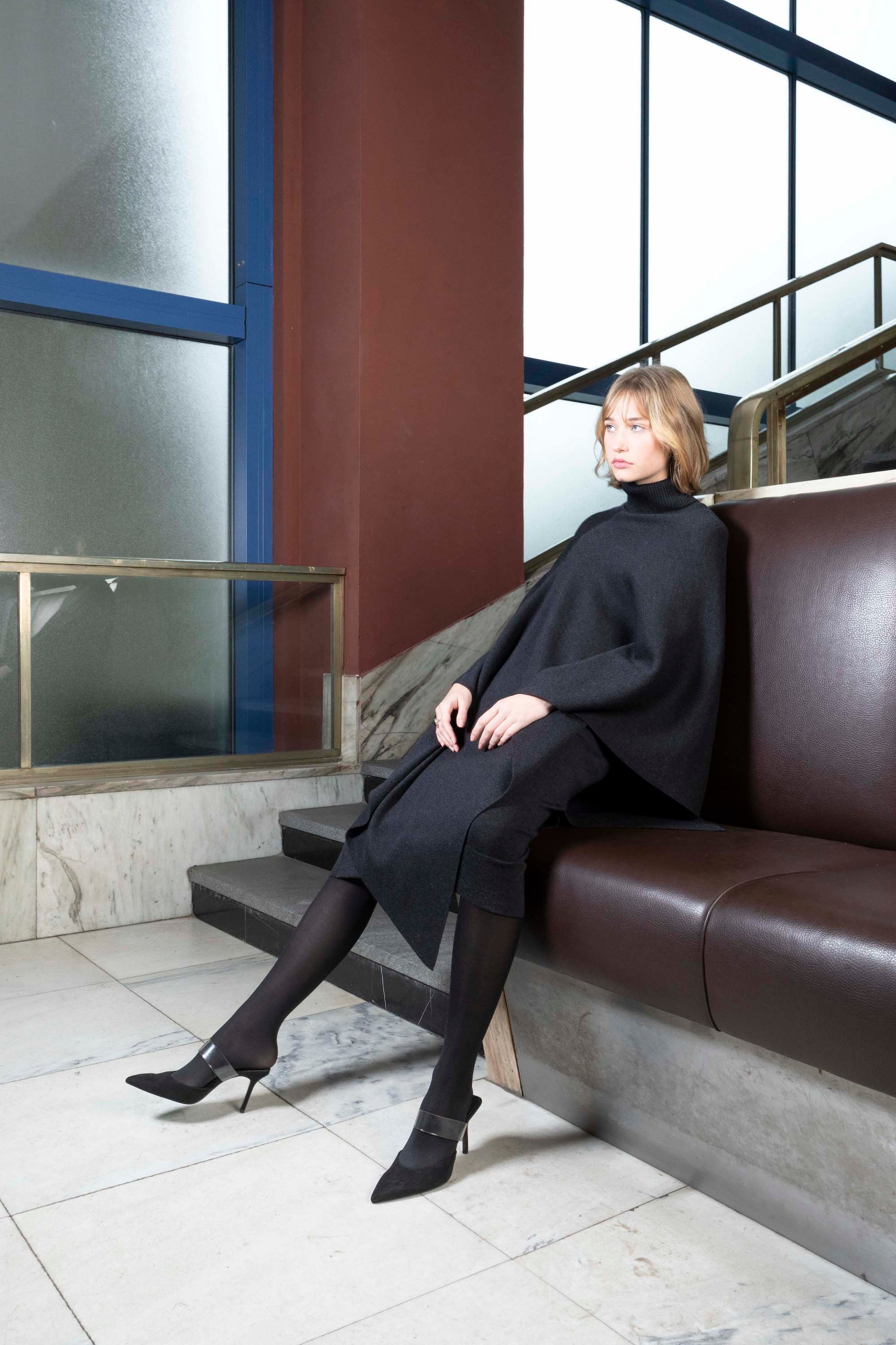 Asymmetric roll-neck poncho knitted from extra fine woolen yarn. Designed and manufactured in the Czech Republic. Material 100% Merino Cashwool®. One size fits all. Model's height 174 cm. Color ANTHRACITE.