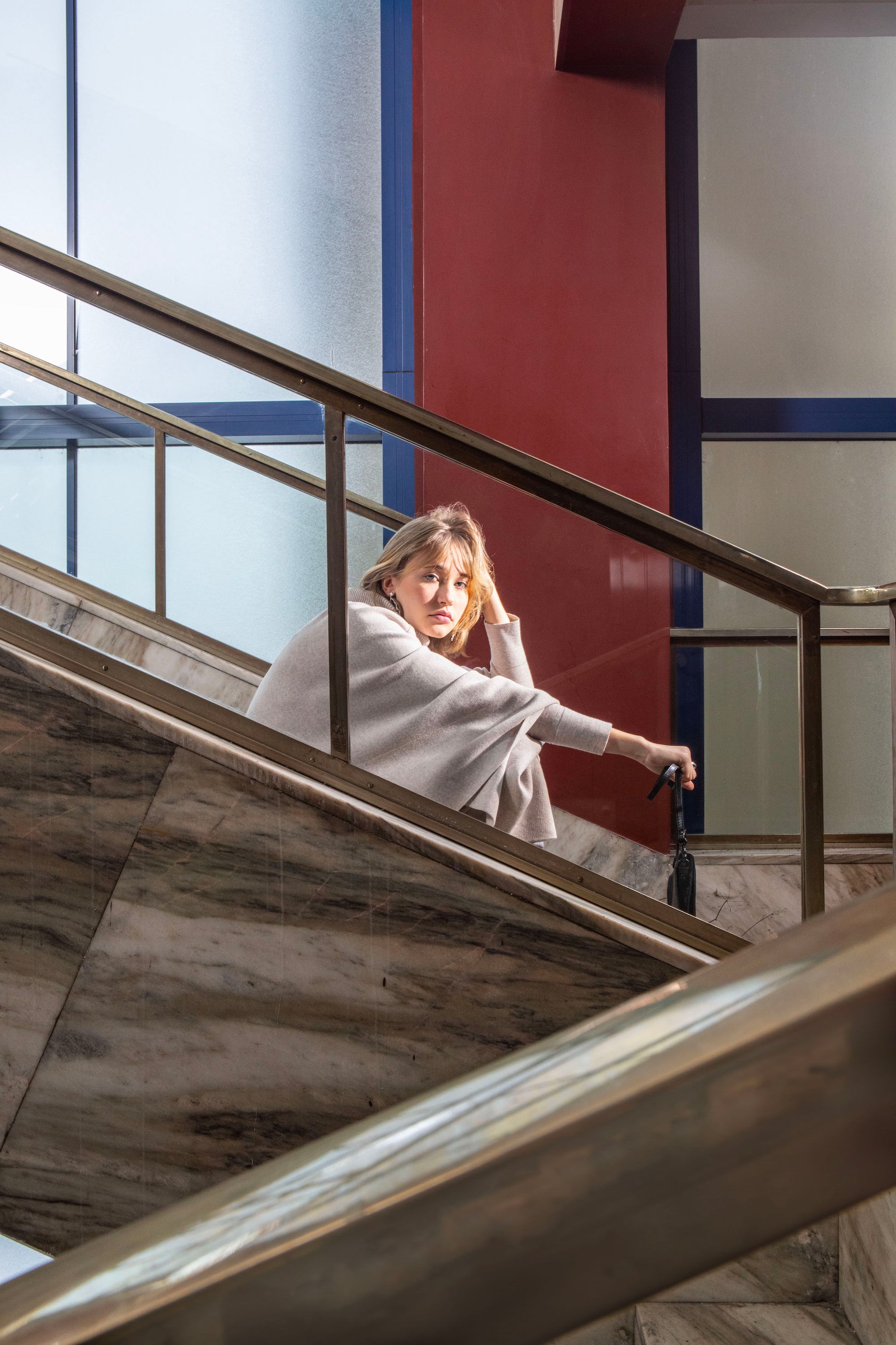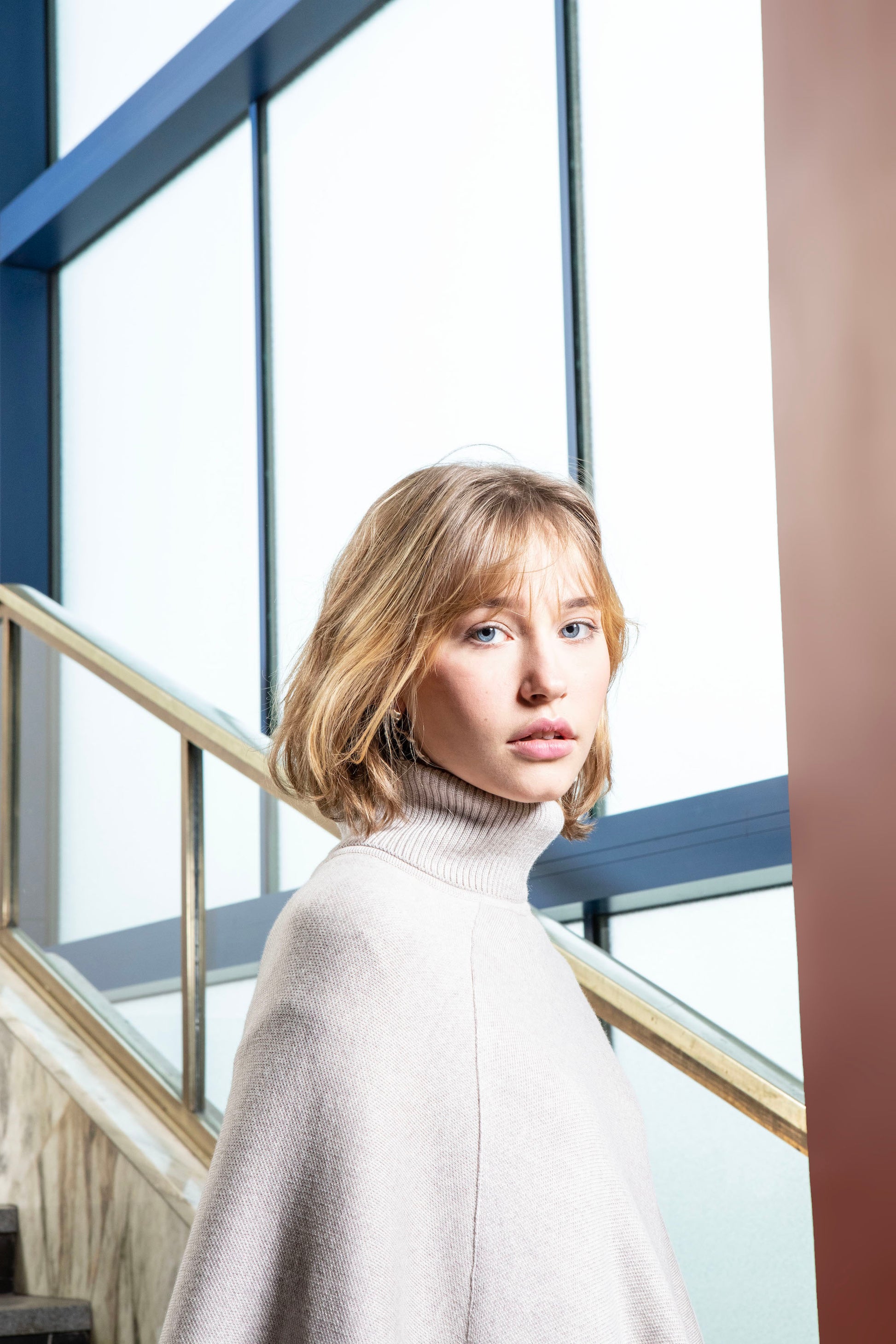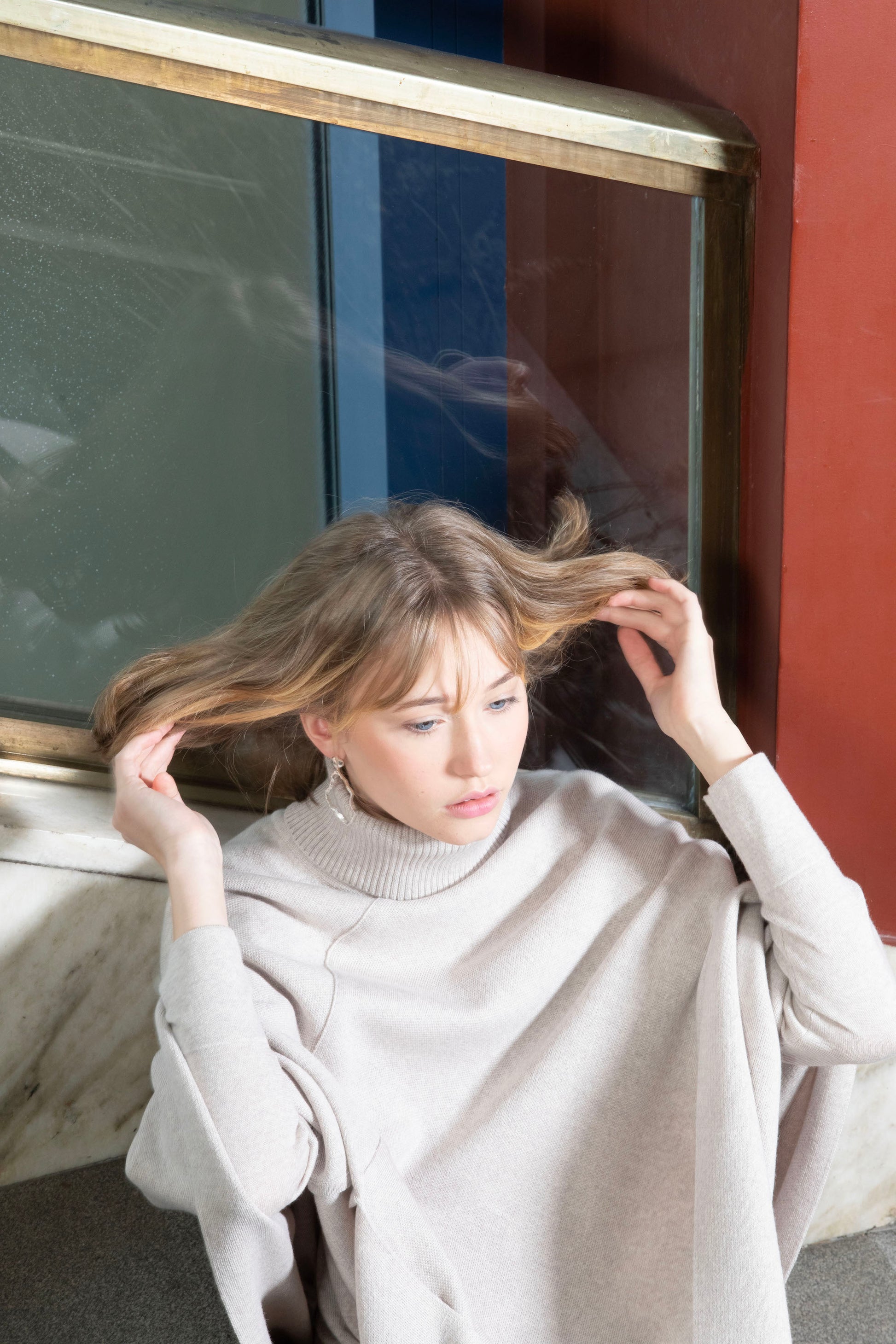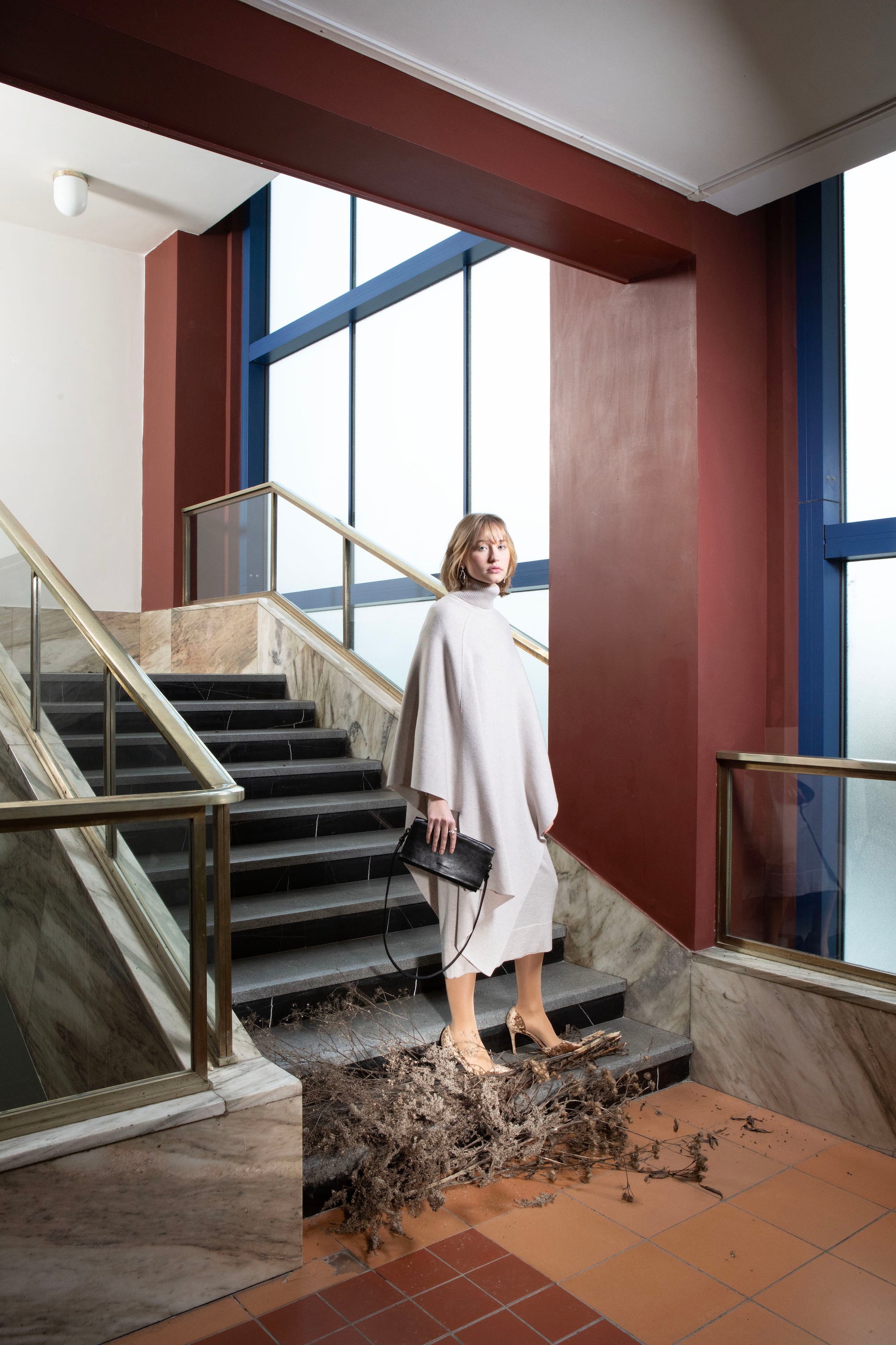 Asymetrické pončo s rolákem pletené z extra jemné vlněné příze. Navrženo a vyrobeno v České republice. Materiál 100% Merino Cashwool ®. Univerzální velikost. Výška modelky 174 cm. Barva PERLA.