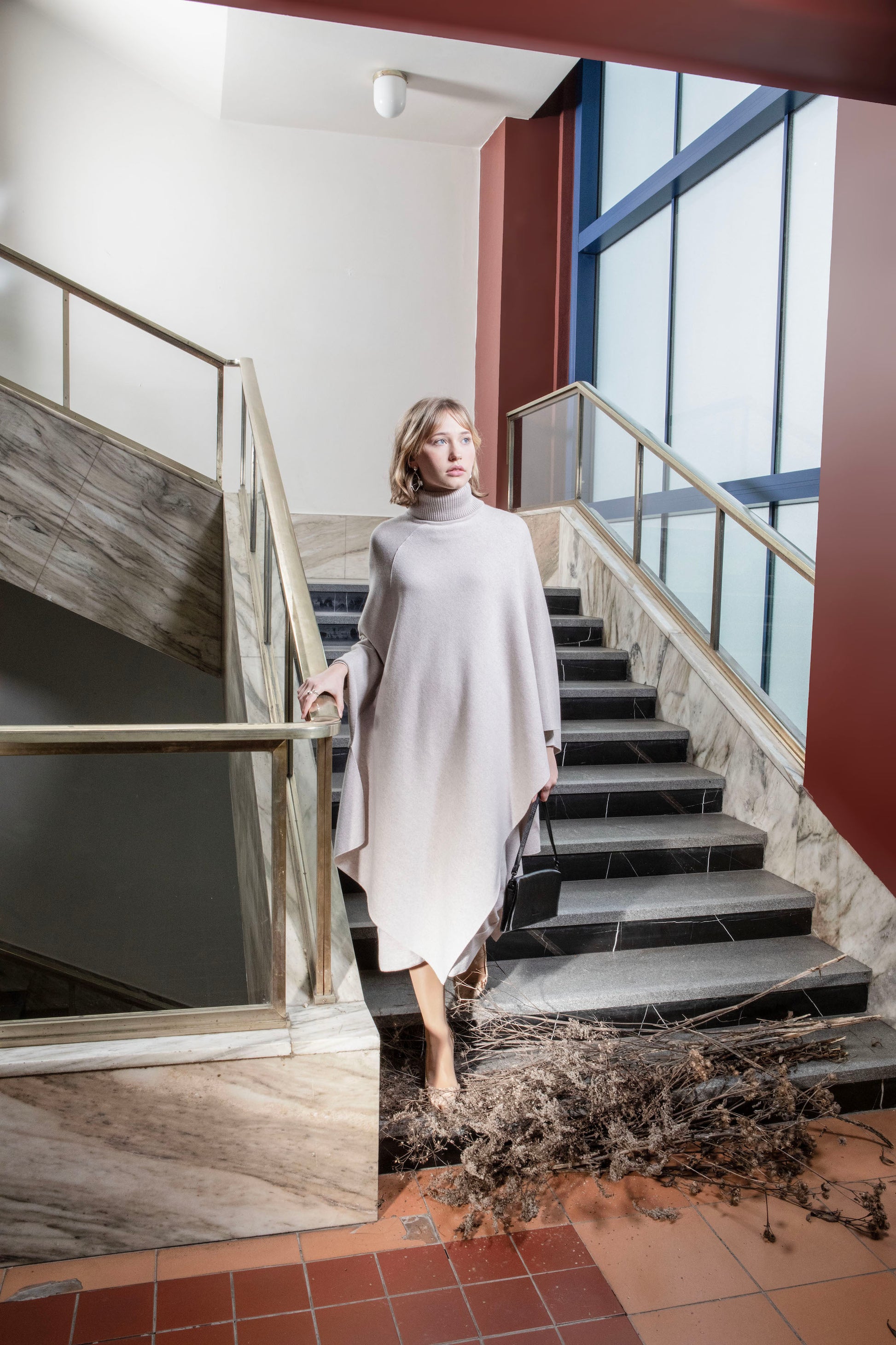 Asymmetric roll-neck poncho knitted from extra fine woolen yarn. Designed and manufactured in the Czech Republic. Material 100% Merino Cashwool®. One size fits all. Model's height 174 cm. Color PEARL.