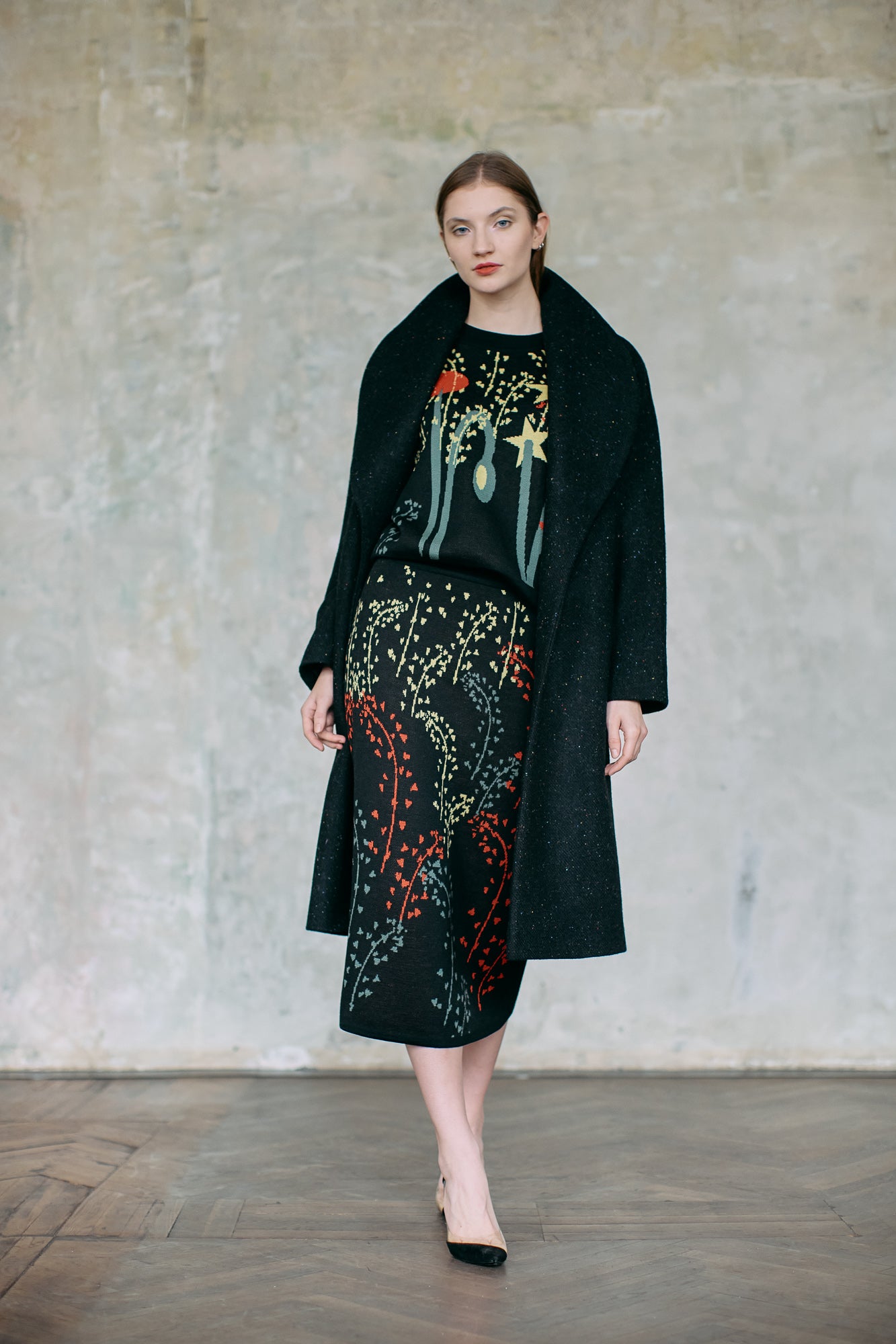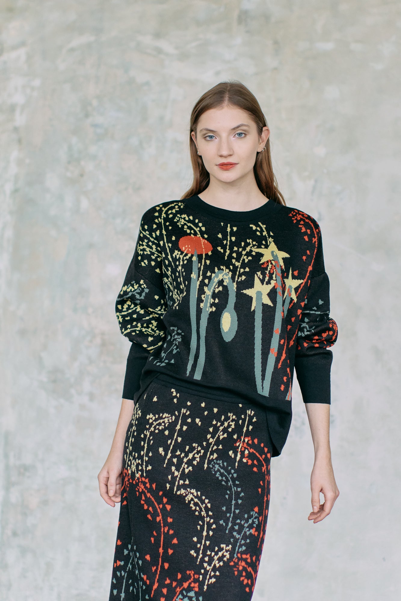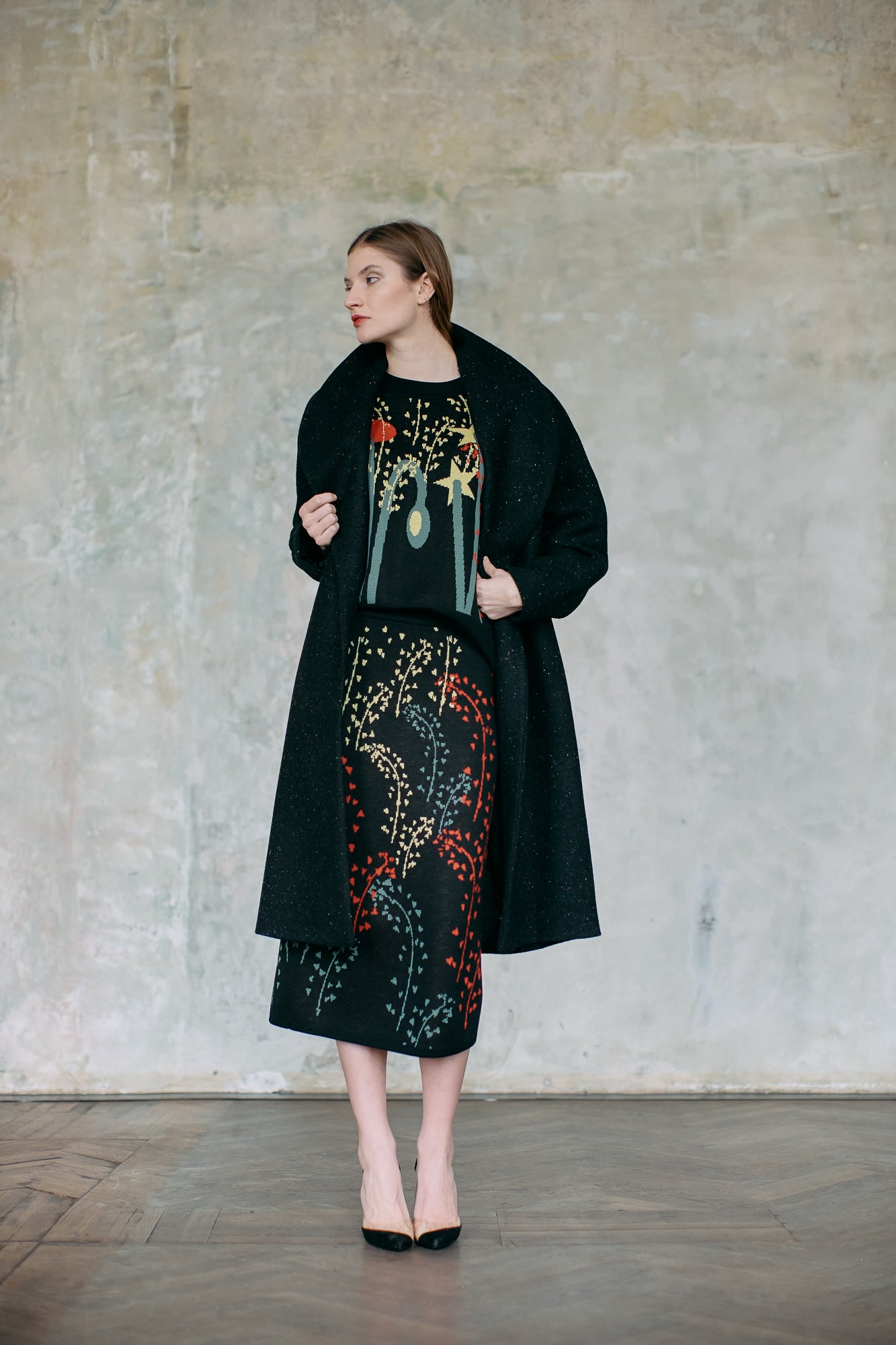 Vlněná sukně pletená žakárovým vzorem, 100% Wool®Cashwool. Jemně stylizovaný vzor trávy na ČERNÉM podkladu. Doplňkové barvy dekoru - ČERVENÁ, ŽLUTÁ, ZELENÁ.