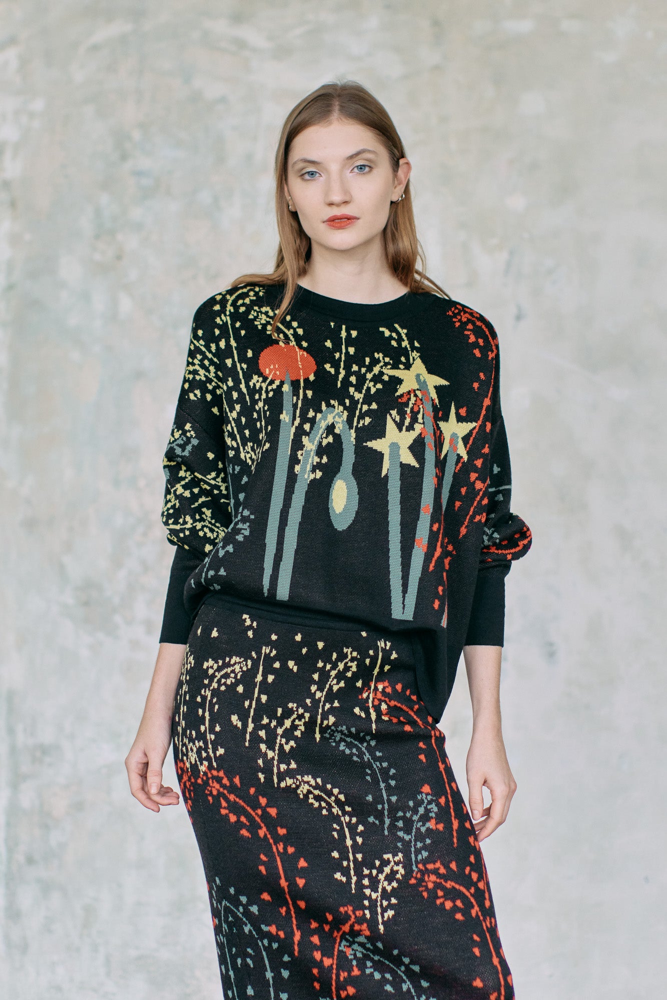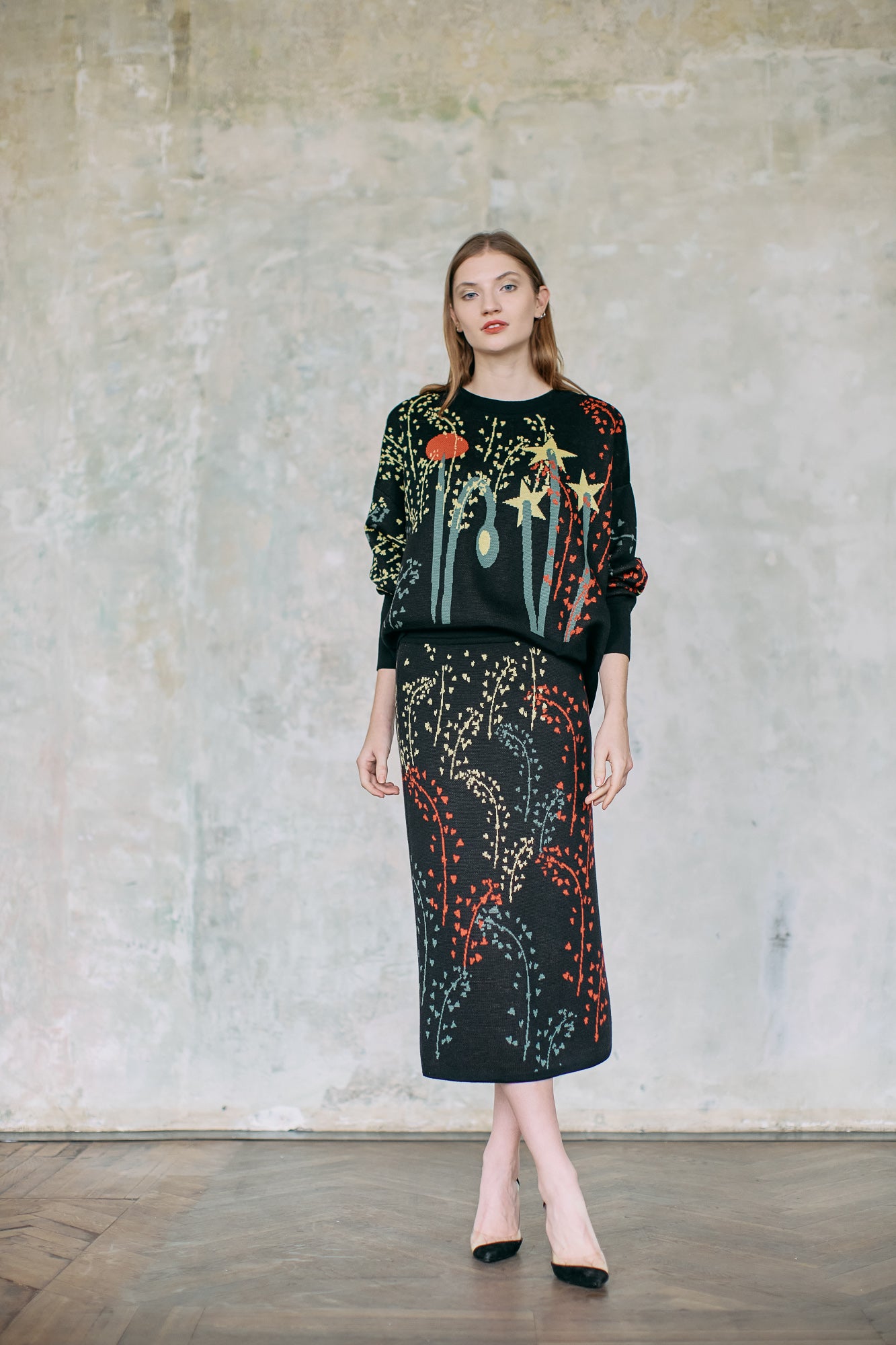 Woolen skirt knitted with a jacquard pattern, 100% Wool®Cashwool. A delicately stylized grass pattern on the BLACK background. Complementary decor colors - RED, YELLOW, GREEN.