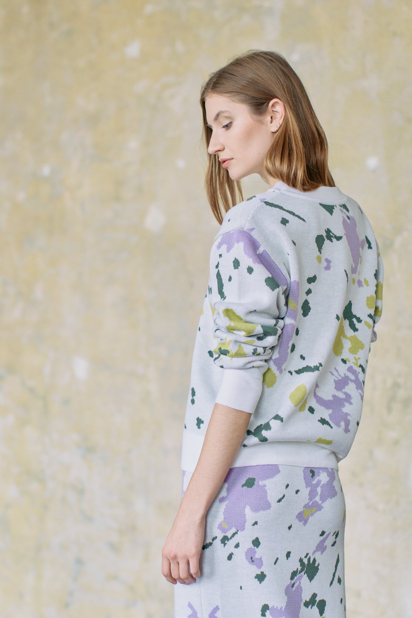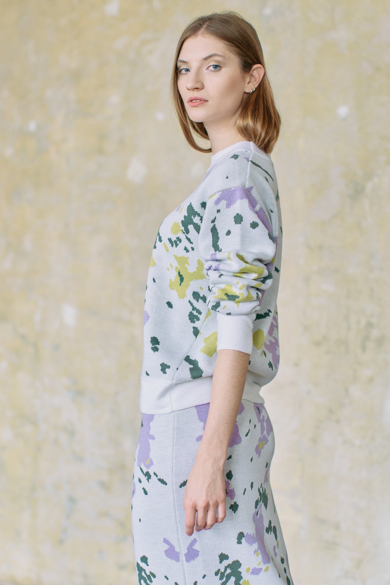 Woolen sweater knitted with a jacquard pattern, 100% Wool®Cashwool. A delicately stylized meadow pattern on the WHITE background. Complementary decor colors - LILAC, YELLOW, GREEN.